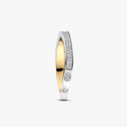 Omfamna den enkla dualiteten med denna TI SENTO guldpläterade silverring. Tillverkad av 925 sterlingsilver förenar denna crossover-design två skulpterade band: ett pläterat i strålande gult guld, det andra platinapläterat och pavéfattat med briljantslipade vita kubiska zirkoner. De böljande linjerna flätas samman i en raffinerad kontrast av skimmer och glans, vilket ger subtil rörelse och gnistra till varje gest. Buren ensam gör den ett elegant uttalande – staplad ger den djup och textur. Nickelfri och allergivänlig, erbjuder den varaktig komfort med en polerad, modern finish. Bredd: 6mm, storlek 56
