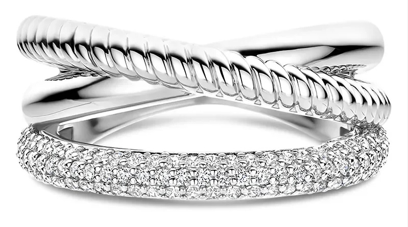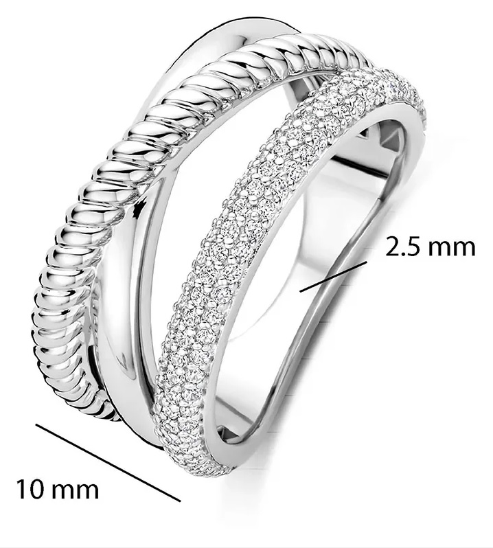 Denna silverring med strukturerade zirkoniadetaljer är tillverkad av högkvalitativt 925 sterlingsilver och har en raffinerad, lager-på-lager-design. Ringen består av tre band: ett med zirkoniastenar, ett med en slät yta och ett med en ribbad, vriden struktur.