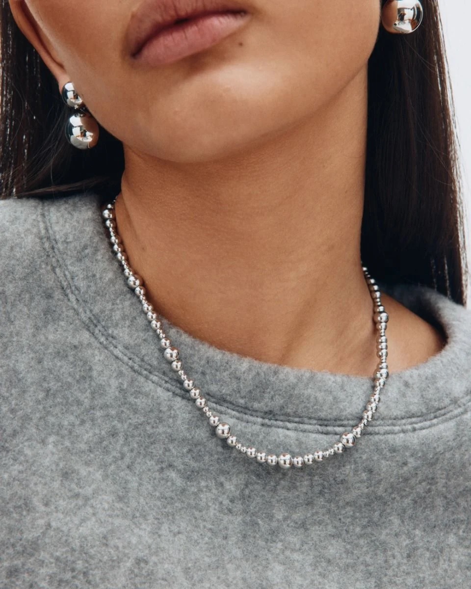 Sphere bygger på en serie sfärer som skapar sin alldeles egna rytm och ett maxat uttryck. Som i det här multihalsbandet i blankt rostfritt stål, med en oregelbunden repetition av större och mindre kulor.