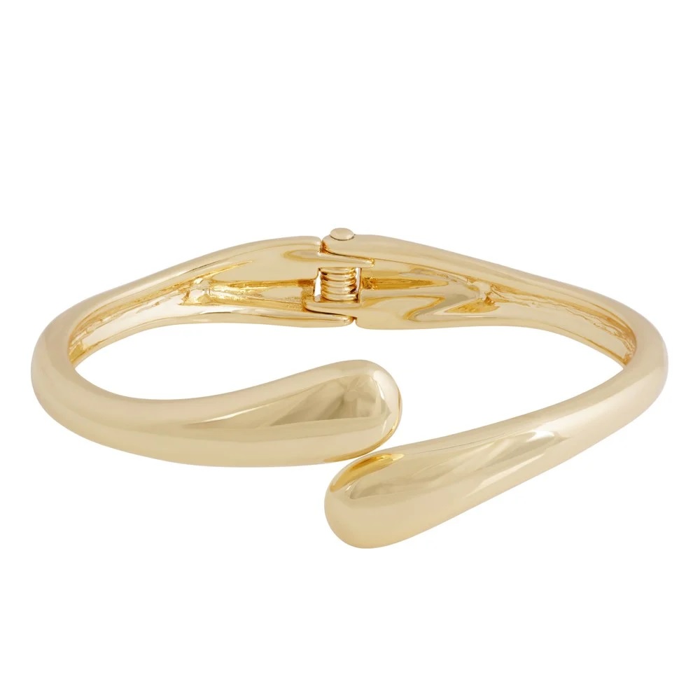 Våra smycken är tillverkade av mässing eller zinklegering och pläterade med 14k guld eller rodiumbehandlat sterlingsilver. Alla produkter uppfyller EU-direktiven REACH (EG) 1907/2006. För att dina smycken ska se så bra ut som möjligt, ta av dem innan du lägger dig, duschar eller tränar. När de inte används, förvara dem på en torr plats. Ett minimalistiskt statement-armband i glänsande metall. Med sin organiska form och släta gångjärn kombinerar det design och funktion på ett perfekt sätt.