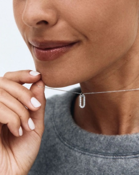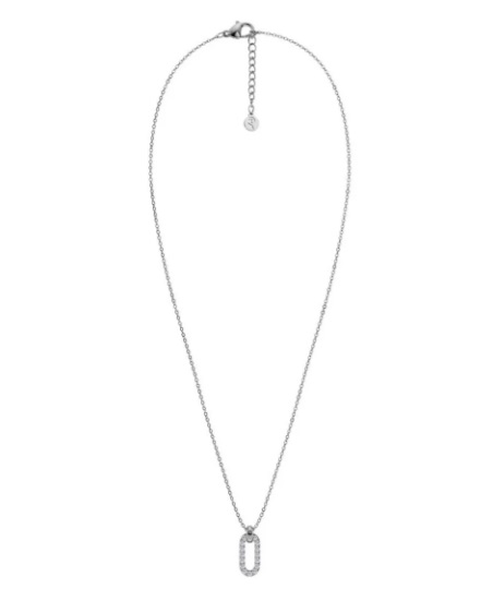 Klassiska Inez kombinerar glittrande stenar med strama geometriska former. Här som ett halsband i blankt rostfritt stål med en avlång form beströdd med stenar som vacker charm på en fasettslipad ankarkedja.