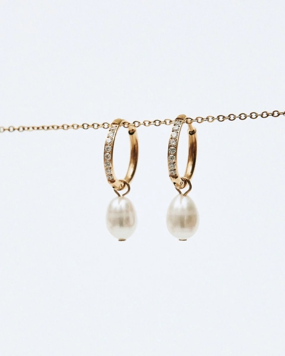De mindre hoopsen i serien Perla har vackra sötvattenpärlor som avtagbara charms på en skena med glittrande stenar. Här i 14K guldplätering.