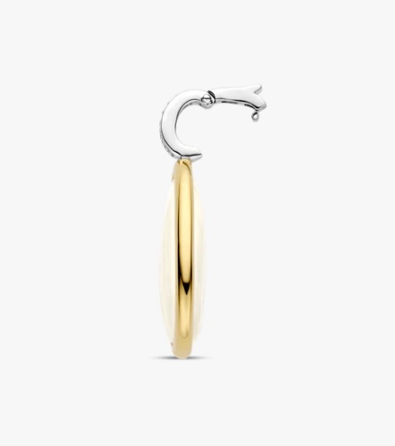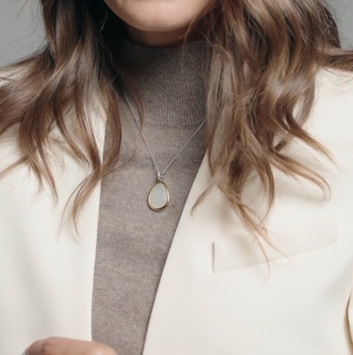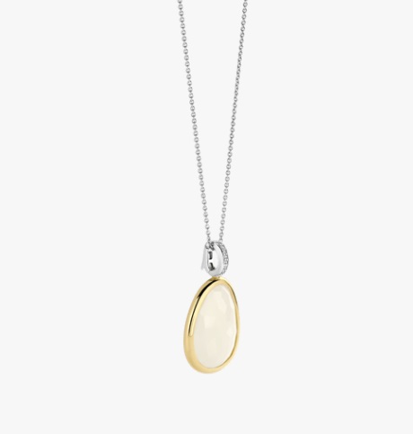 Förhöj allt med detta TI SENTO guldpläterade silverhänge. En månbelyst, mjölkvit sten – handslipad i en oregelbunden fasett – utstrålar ett mjukt inre ljus medan dess varma gulguldsfattning ramar in den organiska konturen med subtil rikedom. Droppen är bunden av en platinapläterad ögla med briljantslipade kubiska zirkoner, som strör små gnistror som spelar på stenens sammetsliknande glans. Hänget levereras med en fin kedja i 925 sterlingsilver, tillräckligt slående för att bäras solo, men ändå tillräckligt raffinerat för att kombineras med kortare chokers för en luftig, personlig stil. Nickelfritt och allergivänligt, ger det enkel komfort dag som natt.