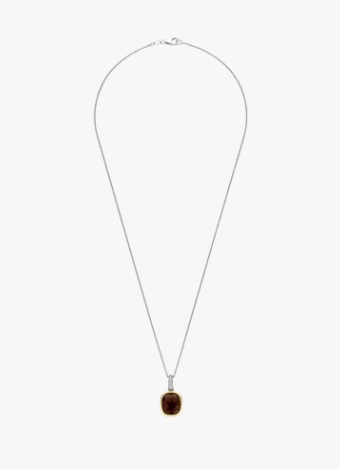 Detta TI SENTO guldpläterade silverhänge ger ett varmt djup. Tillverkat av 925 sterlingsilver, har den avlånga kuddformade stenen en genomskinlig rökbrun nyans, rik i ton och mjukt fasetterad för att reflektera ljuset. En gulguldpläterad bezel ramar in stenen med subtil värme, medan den platinapläterade öglan – pavéinfattad med briljantslipade vita kubiska zirkoner – ger en raffinerad gnistra ovanpå. Dess jordnära nyans och klassiska silhuett gör detta hänge till en mångsidig favorit för både vardagliga och uppklädda tillfällen. Nickelfri och allergivänlig, garanterar den varaktig komfort och förhöjd elegans hela dagen. Hänget levereras med ett elegant silverhalsband.