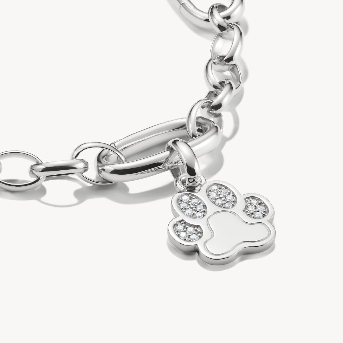 Visa att du bryr dig om dina fyrbenta vänner: Denna berlock tillverkad av återvunnet 925 silver är designad i form av en tass. Små, vita zirkonia-stenar och fina graveringslinjer ger accenter. Charm-hängsmycket är perfekt för att berätta din personliga historia. Tack vare den fina öglan kan du bära den ensam eller tillsammans med andra hängsmycken på ett halsband eller armband efter eget tycke och smak.