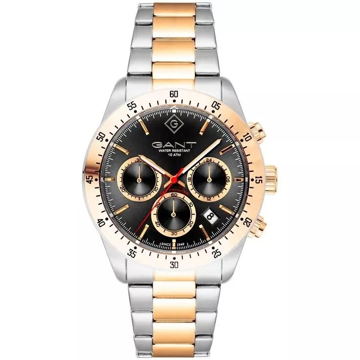 Gants herrkollektion med sportiga och klassiska klockor kombinerar innovation med förstklassigt hantverk för att skapa bestående favoriter som är inspirerade av sitt motto Never Stop Learning. Denna klocka är gjord i rostfritt stål med jonplätering i guld och boett med mineralglas. Den har tidtagning, datumfunktion och 24-timmarsvisning.