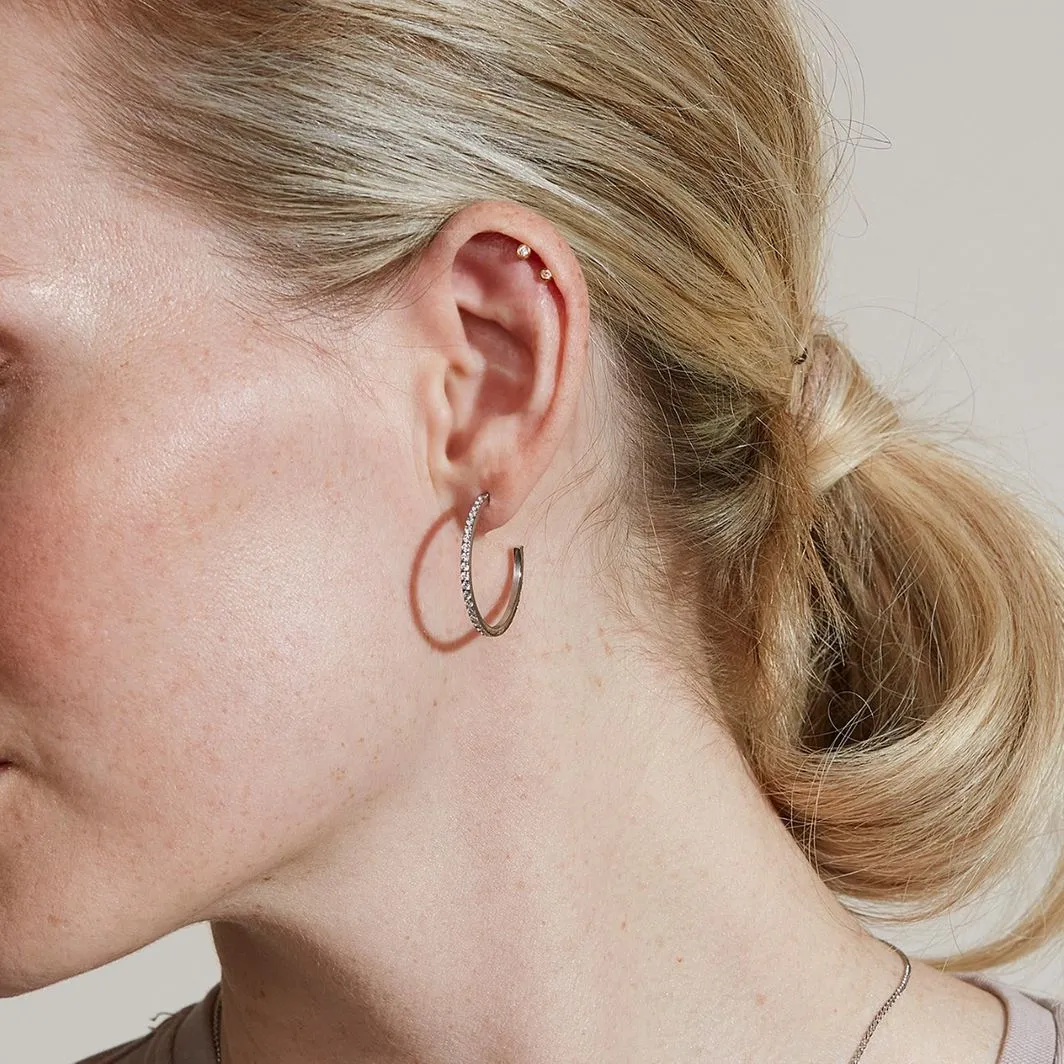 Härliga Glow creoler kommer här i en större modell med fina gnistrande stenar satta runt hela utsidan. Glow creloer mini är elegant tunna och storleken L passar både till vardag och fest. Glow, som är en av våra bästsäljare och mest populära serier, ses här i blankt rostfritt stål.