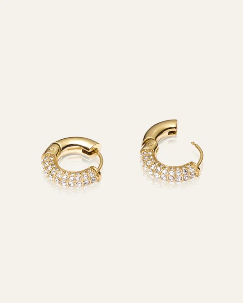 Tillverkade i rostfritt stål med 18K guld PVD-plätering och dekorerade med Cubic zirconia-stenar, är de både slitstarka och vattentåliga. En tidlös design skapad för att bäras varje dag utan att förlora sin glans.