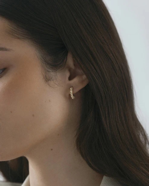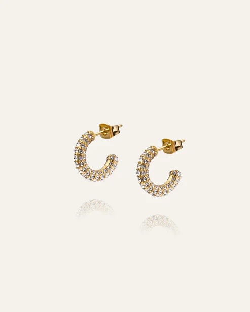 Upptäck Pavé Eternal Small Earrings – små ringar prydda med glittrande vita kubiska zirkoniastenar och pläterade med 18K guld PVD. Perfekta för att ge en touch av elegant elegans till vilken outfit som helst, dessa örhängen är idealiska för både vardagsbruk och speciella tillfällen.