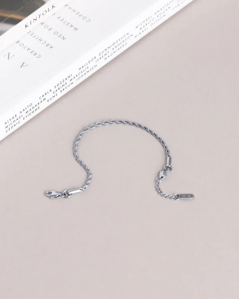 Minimalistiskt och klassiskt – detta tunna armband med tvinnad kedja är ett elegant smycke som passar till alla tillfällen. Tillverkat i rostfritt stål med PVD-plätering är det både slitstarkt och vattentåligt, vilket gör att det behåller sin färg och lyster över tid. Förlängningskedjan kan enkelt tas av för en anpassad passform.