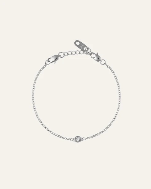 Tidlös elegans i minimalistisk design. Det tunna armbandet har en nätt, finlänkad kedja med en rund vit Cubic Zirconia-sten. Tillverkat i rostfritt stål med PVD-plätering är det både slitstarkt och vattentåligt, vilket gör att det behåller sin färg och glans över tid. Förlängningskedjan kan enkelt tas av för en anpassad passform.