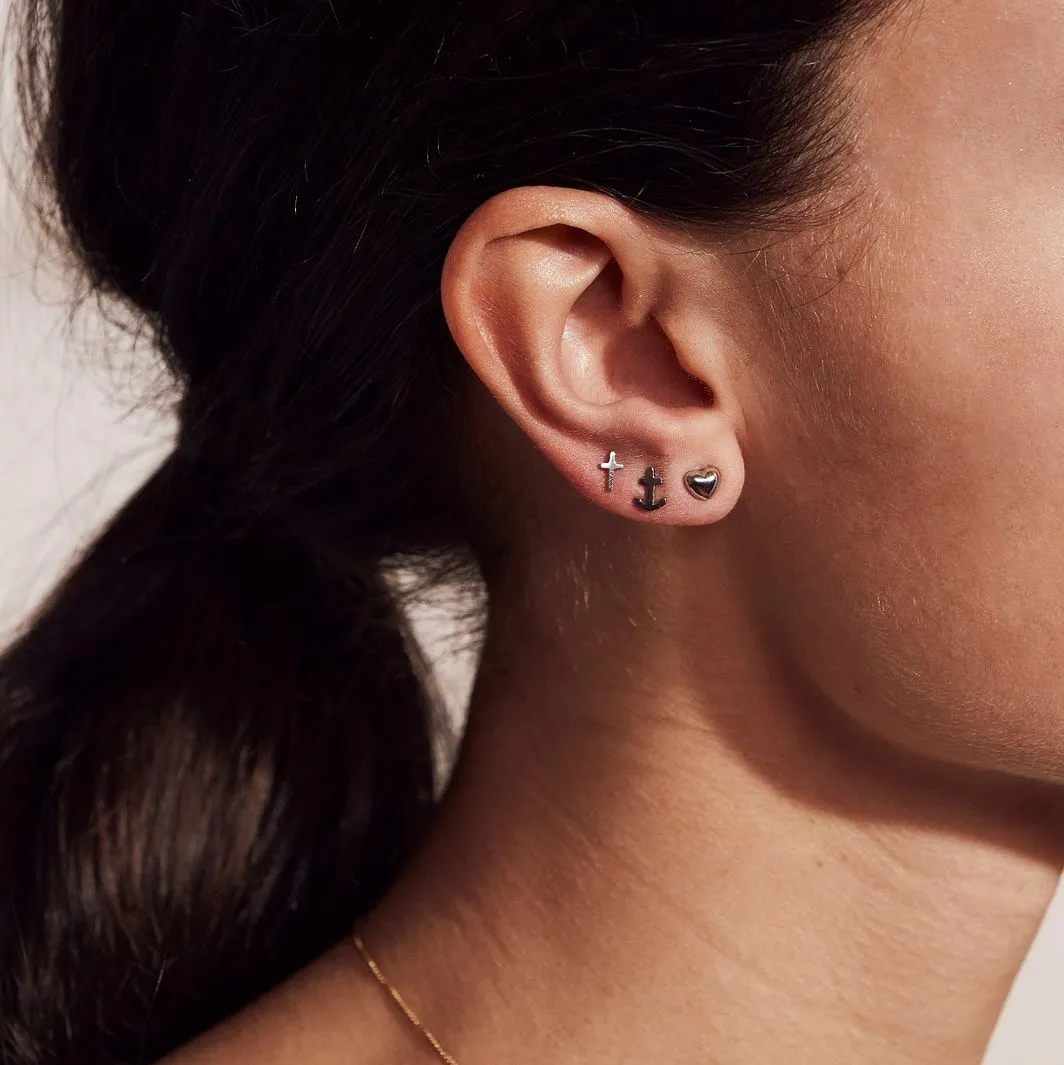 One är tre små studs med de klassiska symbolerna för Tro Hopp och Kärlek. Vi ser ett ankare, ett kors och en litet fylligt hjärta, här i blankt rostfritt stål. Skapa din personliga kombination för ett eller flera hål i öronen.