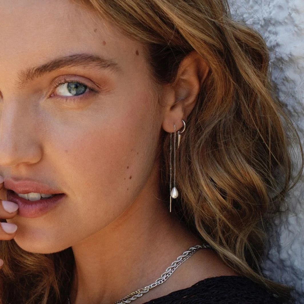 Chain earrings är långa trendiga örhängen som här har Pearl, en vacker sötvattenpärla som dekoration i slutet av kedjan. Pearl chain örhängen är så snygga på och att bära tillsammans med fler örhängen, en favorit alla dagar i veckan. I Pearl chain bestämmer du själv hur lång kedja du vill ha framtill och bakom örat genom att dra kedjan till önskad längd, ses här i blankt rostfritt stål.
