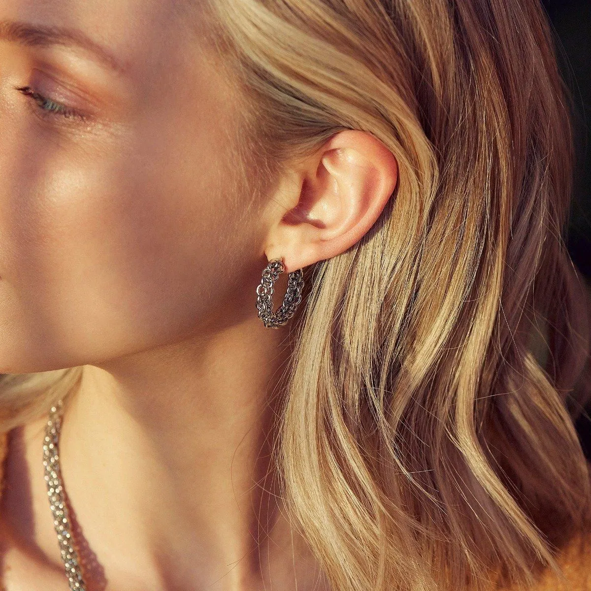 I Prim ser vi en lyxig rund lite kraftigare kedja som är så trendigt. I Prim örhängen har vi låtit kedjan bli halvcreoler som är så snygga på. Örhängena är av kedjan lantern chain och ses här i blankt rostfritt stål.