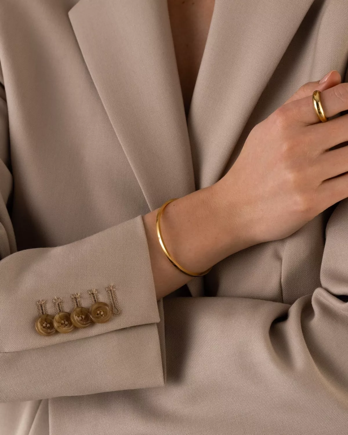 Bada, duscha och dansa i den utan att oroa dig för att den ska tappa färg. Tillverkad av massivt rostfritt stål med en 18K guld PVD-plätering som gör den vattentålig.