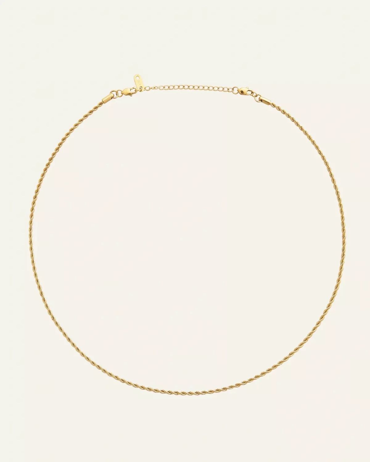 Det här vackra halsbandet har formen av ett tunt rep. Designen är klassisk och minimalistisk och passa till allt. Kedjan är tillverkad i massivt rostfritt stål som sedan har en 18K guld PVD-beläggning vilket gör den mycket slitstark och dessutom vattentålig. Bada, duscha och träna i detta smycke utan att oroa dig för att det ska tappa färg. Förlängningskedjan går att ta av om man önskar.
