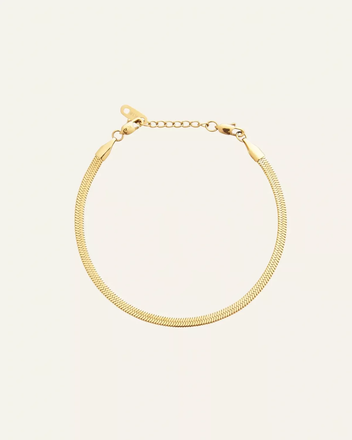 Skin lite extra med detta eleganta snake armband. Matchar perfekt med snake halsbandet i samma kollektion. Kedjan är tillverkad i massivt rostfritt stål som sedan har en 18K guld PVD-beläggning vilket gör den mycket slitstark och dessutom vattentålig. Bada, duscha och träna i detta smycke utan att oroa dig för att det ska tappa färg. Förlängningskedjan går att ta av om man önskar.