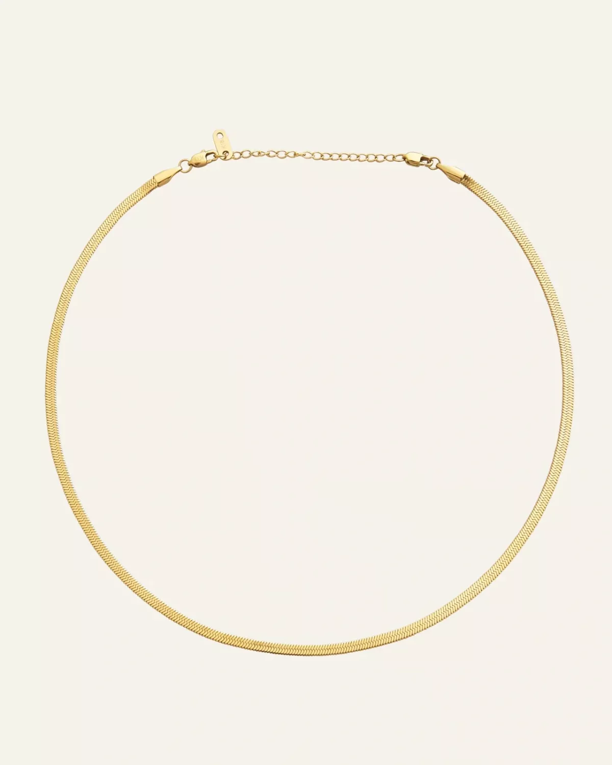 Elegant snake-halsband. Matchar perfekt med snake-armbandet i denna kollektion. Kedjan är tillverkad i massivt rostfritt stål som sedan har en 18K guld PVD-beläggning vilket gör den mycket slitstark och dessutom vattentålig. Bada, duscha och träna i detta smycke utan att oroa dig för att det ska tappa färg. Förlängningskedjan går att ta av om man önskar.