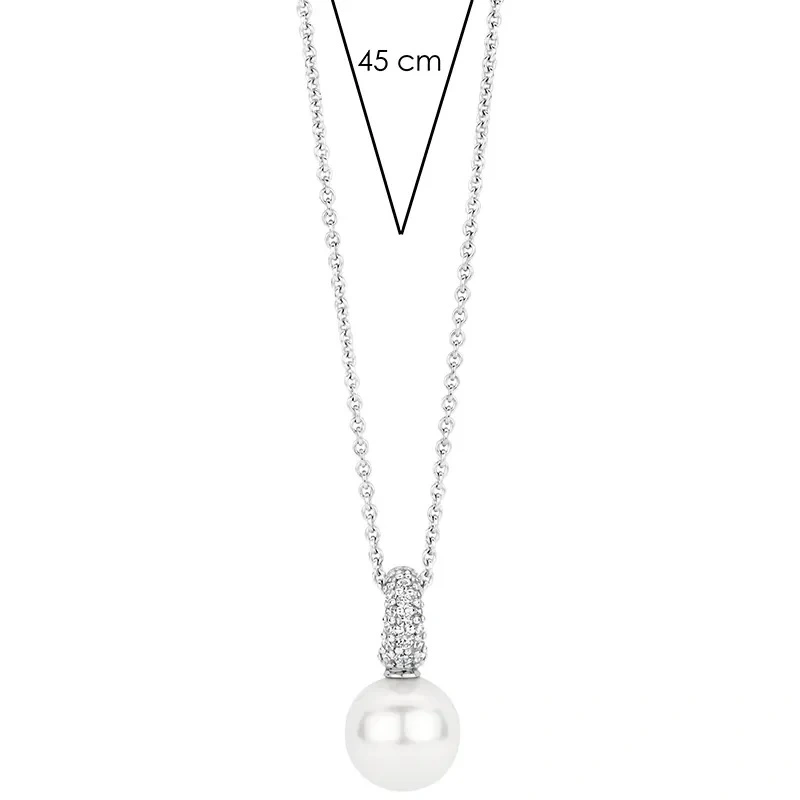 Skäm bort dig med den eteriska skönheten i detta TI SENTO Pearl Pendant halsband. Tillverkad av 925 sterling silver och pläterad med platina för varaktig briljans, detta hänge har en fängslande rund pärla med ett unikt fantasisnitt. Pärlans oregelbundna form ger en touch av nyckfullhet och individualitet. Runt pärlan finns bländande vita cubic zirconia stenar som en skimrande gloria. Detta hängsmycke är ett bevis på konsten av fina smycken, och erbjuder en harmonisk blandning av tradition och modern stil. Kombinationen av pärlans naturliga skönhet och gnistan från cubic zirconia skapar en fängslande effekt. Bär den ensam för ett minimalistiskt uttryck eller i kombination med andra halsband för en personlig touch som utstrålar enkel chic. Specifikationer Material: Silver, pläterad med platina Stentyp: Skalpärla