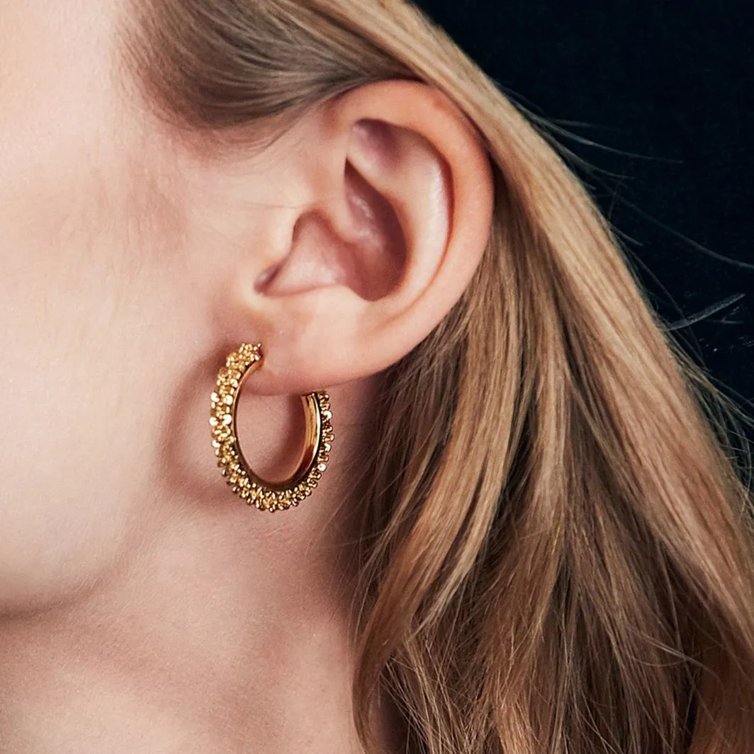 Tinsel örhängen har små, fint sammanvävda metallöglor som ger en lyxig glittrande känsla. Tinsel finns i flera färger och ses här i blank 14K guldplätering.