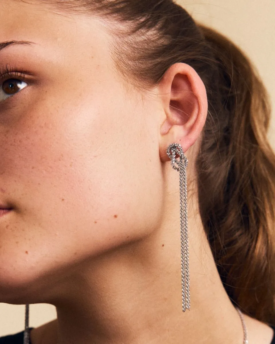 Tinsel Festive örhängen är riktiga shoulder dusters med sina långa kedjor som vävs samman i en elegant knut. Örhängena ses här i blankt rostfritt stål.